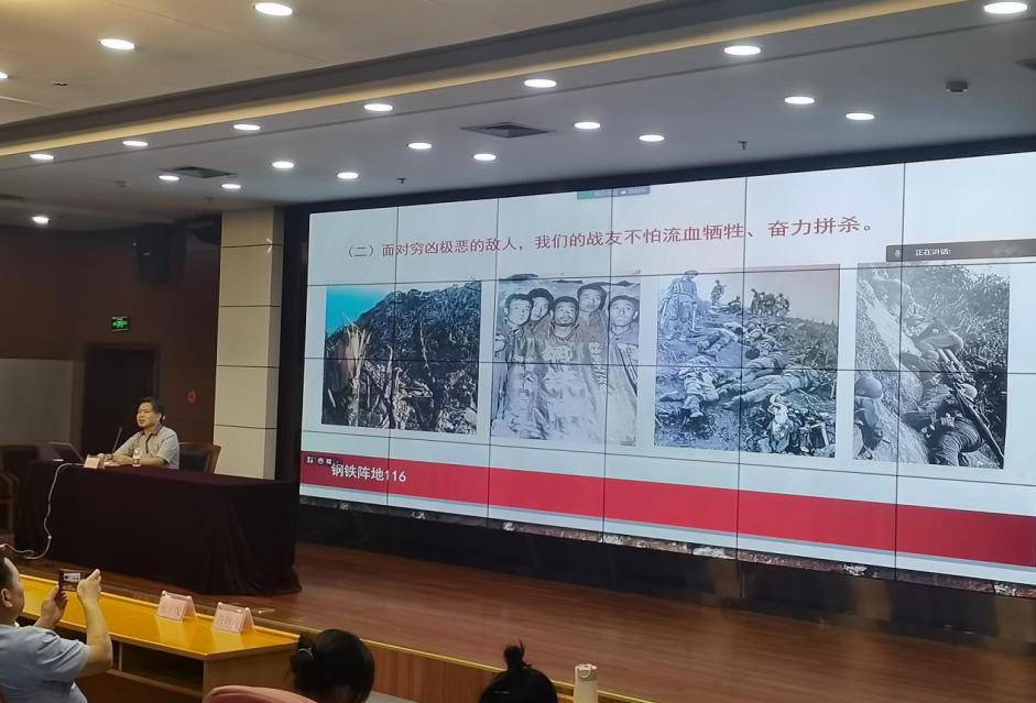 许佳文以《老山英雄与老山精神——百年党史中一段不能忘却的历史》为主题,结合自己的亲身战斗经历详细阐释了“什么是老山精神”“老山精神是怎么诞生的”以及“如何进一步弘扬老山精神”等问题。他详细讲述了对越自卫反击战的诞生背景以及解放军战士在艰苦环境中浴血拼杀,用生命与鲜血书写保家卫国的英雄往事。战斗英烈深刻阐释了“国家至上、人民至上、奉献至上”和“不怕苦、不怕死、不怕吃亏”的老山精神。