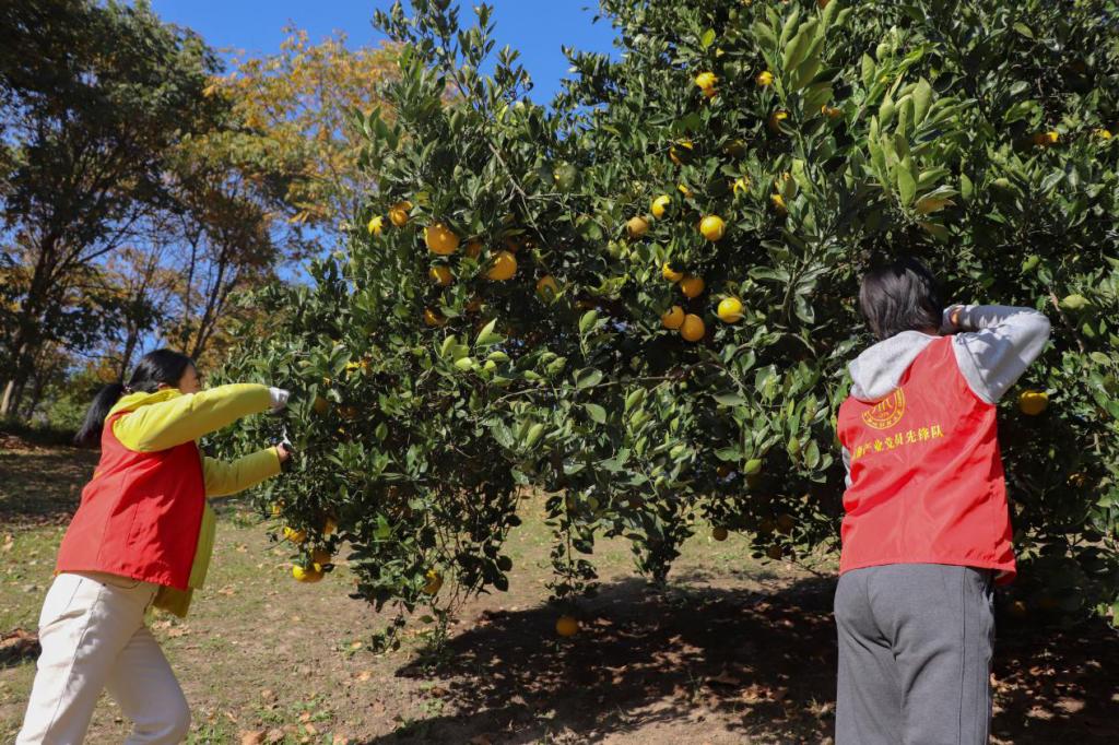 活动现场,师生们三人一组展开作业,大家分工明确、通力配合,摘、拧、剪招式频出,采摘、装筐、运输环环相扣,不多时便收获了一筐筐金灿灿的胡柚。