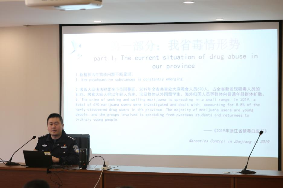 本网讯 3月28日,“护航亚运 禁毒有我”外籍师生禁毒宣传周正式启动。活动特邀杭州市公安局钱塘分局白杨派出所毛煦恒警官作禁毒专题讲座。相关职能部门、学院负责人,在校外籍师生代表等共计100余人参加。