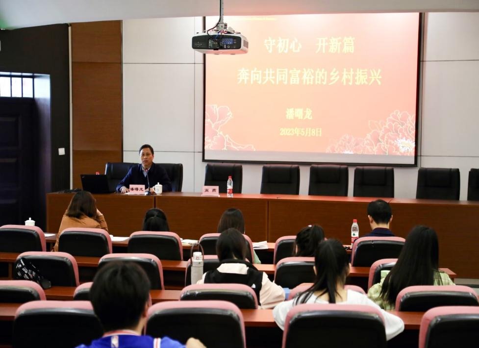 本网讯为扎实推进学习贯彻习近平新时代中国特色社会主义思想主题教育,5月8日,人文与传播学院邀请浙江省优秀共产党员、浙江省“千名好支书”、杭州市临安区板桥镇上田村党总支书记潘曙龙以“守初心 开新篇 奔向共同富裕的乡村振兴”为题,为学院师生党员讲授专题党课,并聘请潘曙龙为学院分党校校外特聘导师。