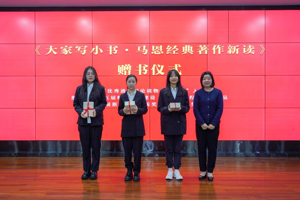红旗出版社副总经理王晓宇向学生代表赠送了《大家写小书·马恩经典著作新读》丛书第一辑。该书入选中宣部2020年“优秀通俗理论读物出版工程”,并获得浙江省第十五届精神文明建设“五个一工程”奖,第30届浙江树人出版奖图书奖等。