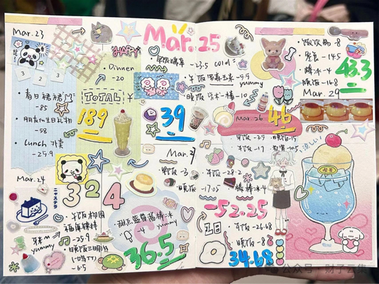 唱歌的鸭子,跳舞的小熊……可爱的漫画、贴纸加上每一笔支出旁滑稽的文字注释,无不是大学生们活泼风趣的内心写照,“健康可爱,没有眼袋”,他们用这样轻松幽默的方式纾解一天的压力,排遣心中的烦忧,对这些青葱少年们而言,也许多年之后再翻出这些账簿,透过简短的数字与小记,也能勾起对那段平淡却又不乏起伏的时光笔墨的回忆。