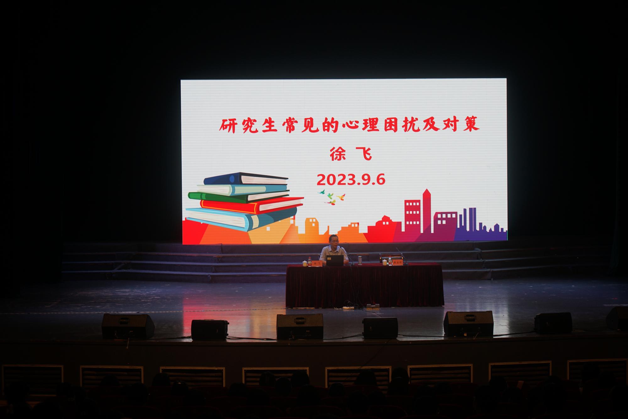 学校心理健康教育中心副主任徐飞向全体新生开展心理健康教育,他将心理健康与中国传统文化相结合,介绍了常见的心理困扰与成因、如何管理情绪和应对困扰等心理健康知识。