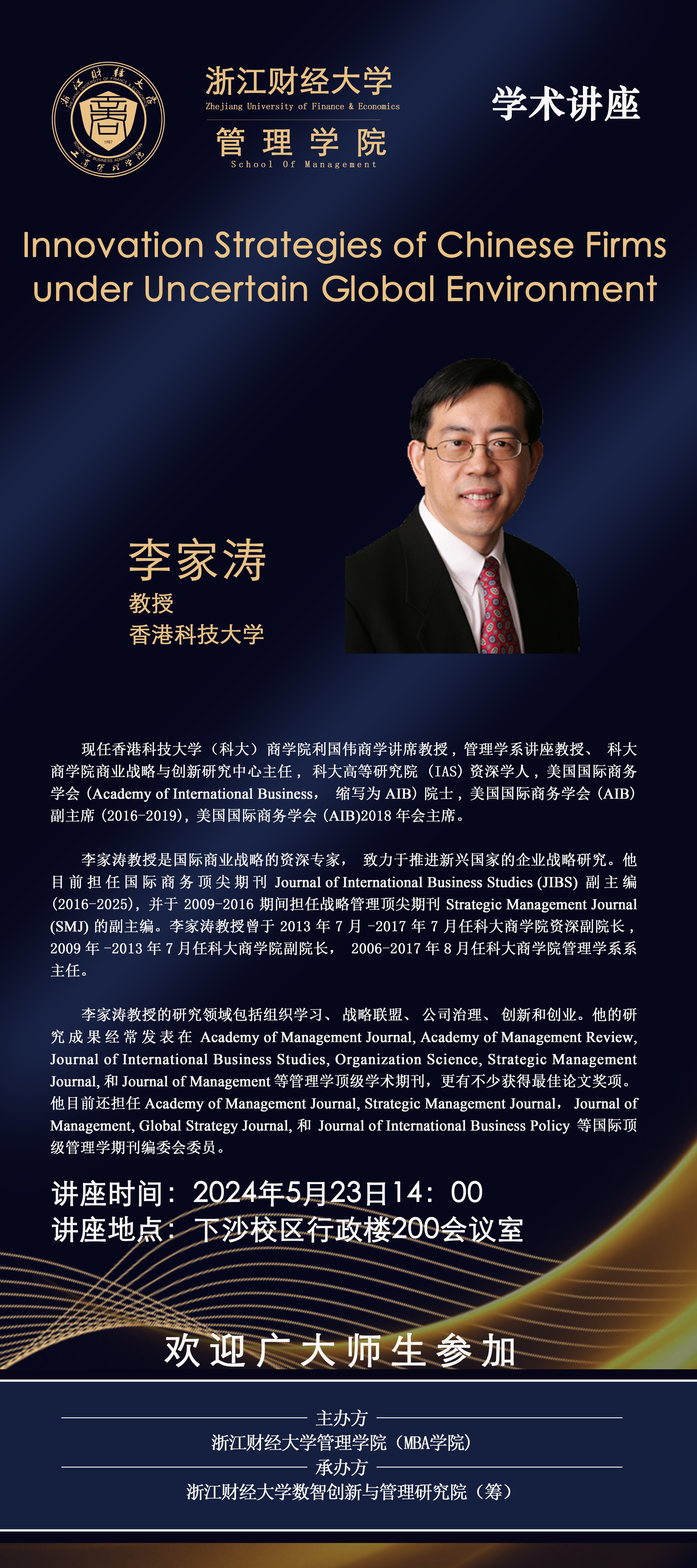 【管理学院公开讲座】李家涛教授:Innovation Strategies of Chinese Firms under Uncertain Global Environment