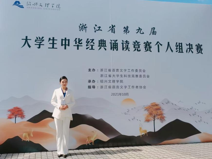 以赛为师,她至今已取得央广网语艺节演讲比赛全国二等奖,浙江省大学生中华经典诵读竞赛省一等奖,省艺术节朗诵比赛一等奖,省艺术节话剧比赛一等奖等艺术类奖项国家级6项,省级14项,市、校级奖项百余项。