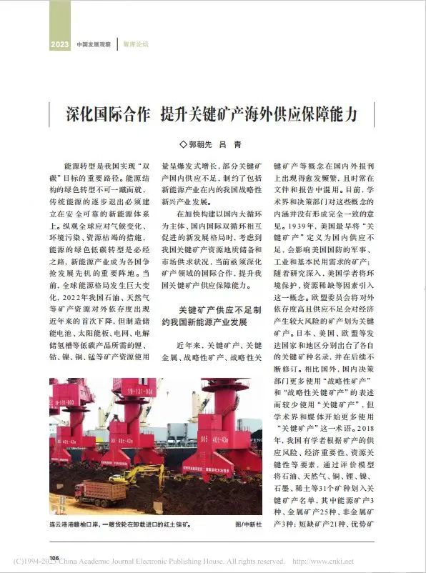 近日,我院2021级产业经济学专业研究生吕青同学和中国社会科学院大学导师郭朝先教授合作的文章《深化国际合作 提升关键矿产海外供应保障能力》在《中国发展观察》2023年第6期发表。文章研究分析了我国当下新能源发展过程中部分关键矿产缺失的现状,并基于新发展格局的构建提出建议。