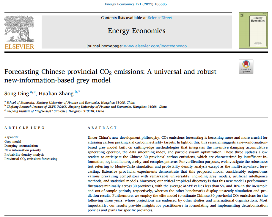 近日,经济学院副教授丁松与我院硕士生张华汉的论文《Forecasting Chinese provincial CO2emissions: A universal and robust new-information-based grey model》在国际顶级能源经济与管理领域期刊Energy Economics(SSCI,IF=9.252,二区Top)上发表。